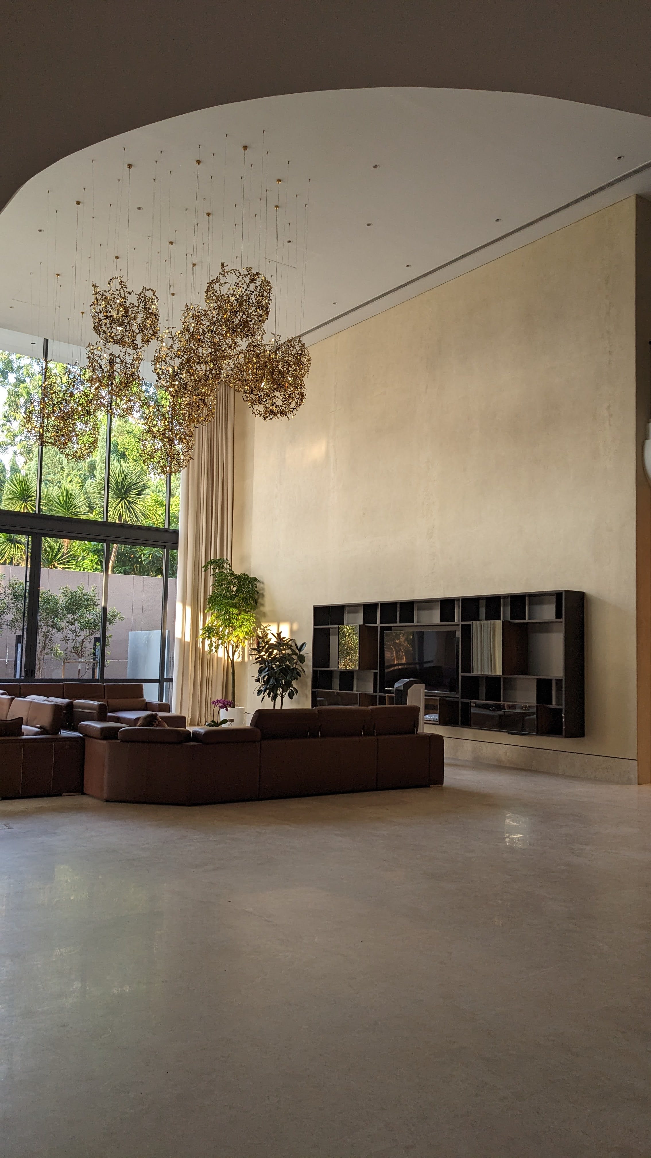 紅色的土牆是屋主的祈禱室,採用這個家地下的原土製成塗料再塗抹,形成了一種真誠樸實的寧靜;黃色的土牆是茶室,也是屋主第一個接待客人的空間,這個顔色可以讓人在最短的時間內平靜下來;大廳的土牆,採用了和地上還有外牆相近的顏色,讓人感覺到屋主的大氣但又不炫富且溫馨和諧的感覺。都是土的顔色,都是寧靜的感覺,但卻又很不一樣。